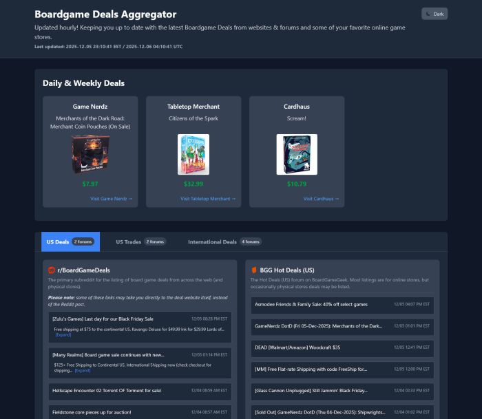 An aggregator of boardgame daily deals (from online boardgame stores) and forum posts (from Reddit and