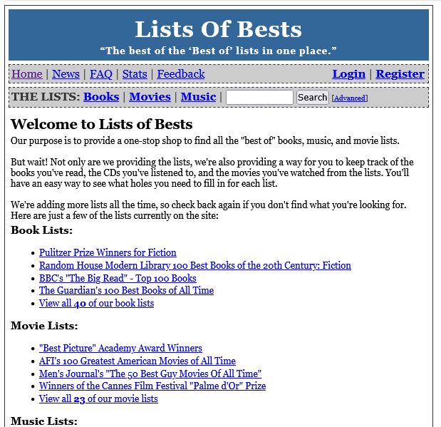 A collection of "best of" lists for music, films, and books which allowed users to check off and keep track of